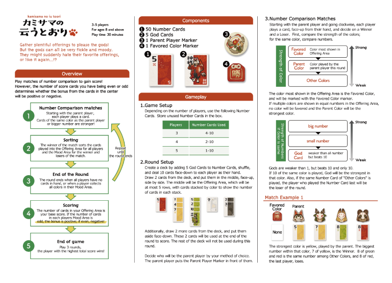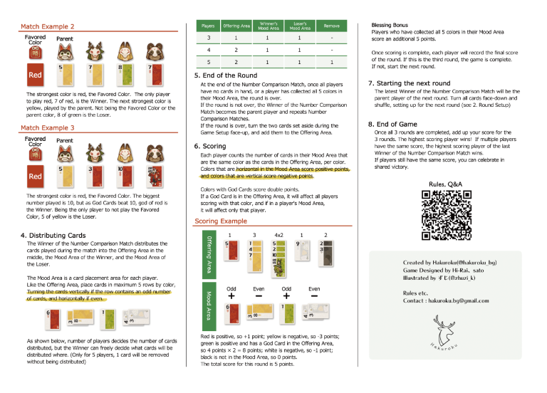 EN JP TW 【TIPS】 You may play a card of a different color than the lead color. Even if you have cards of the lead color in your hand, you may choose to play a card of a different color instead. The game ends when the Offering Area contains all five colors. Discard any remaining cards in your hand; do not add them to the Offering Area or your Mood Area. 【Rulebook】